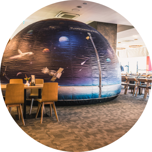 Naše mobilní planetárium je postavené na nejmodernějších projektorech a speciálně upraveném povrchu kupole, kde se diváci cítí součástí vesmírného dobrodružství, a to bez potřeby 3D brýlí. Programy jsou vhodné pro všechny věkové kategorie a filmy vybíráme vždy na míru Vašim potřebám.